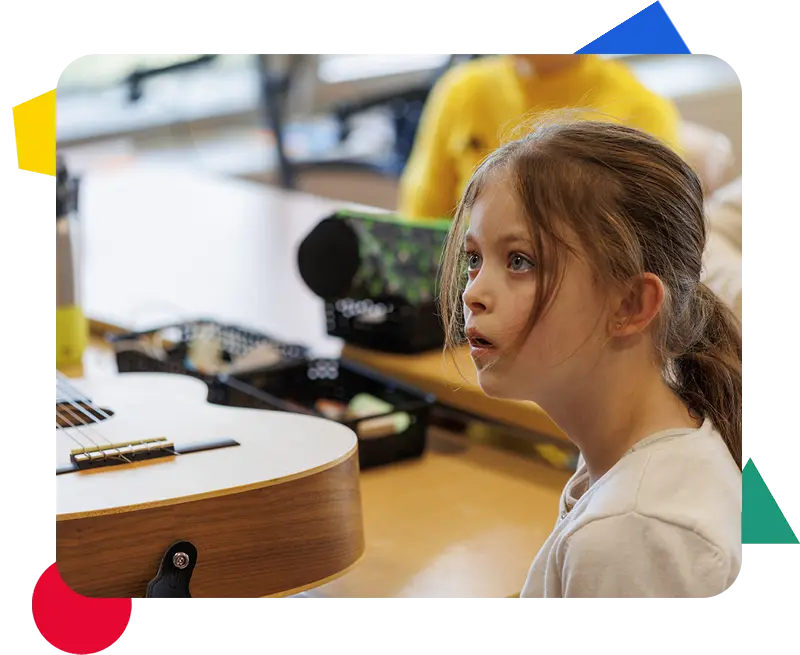 Een vrouw zit tegenover een jongen in een rolstoel in een klaslokaal en houdt een gele bal vast. Op de achtergrond zit een ander kind aan een tafel met uitgestrekte arm.
